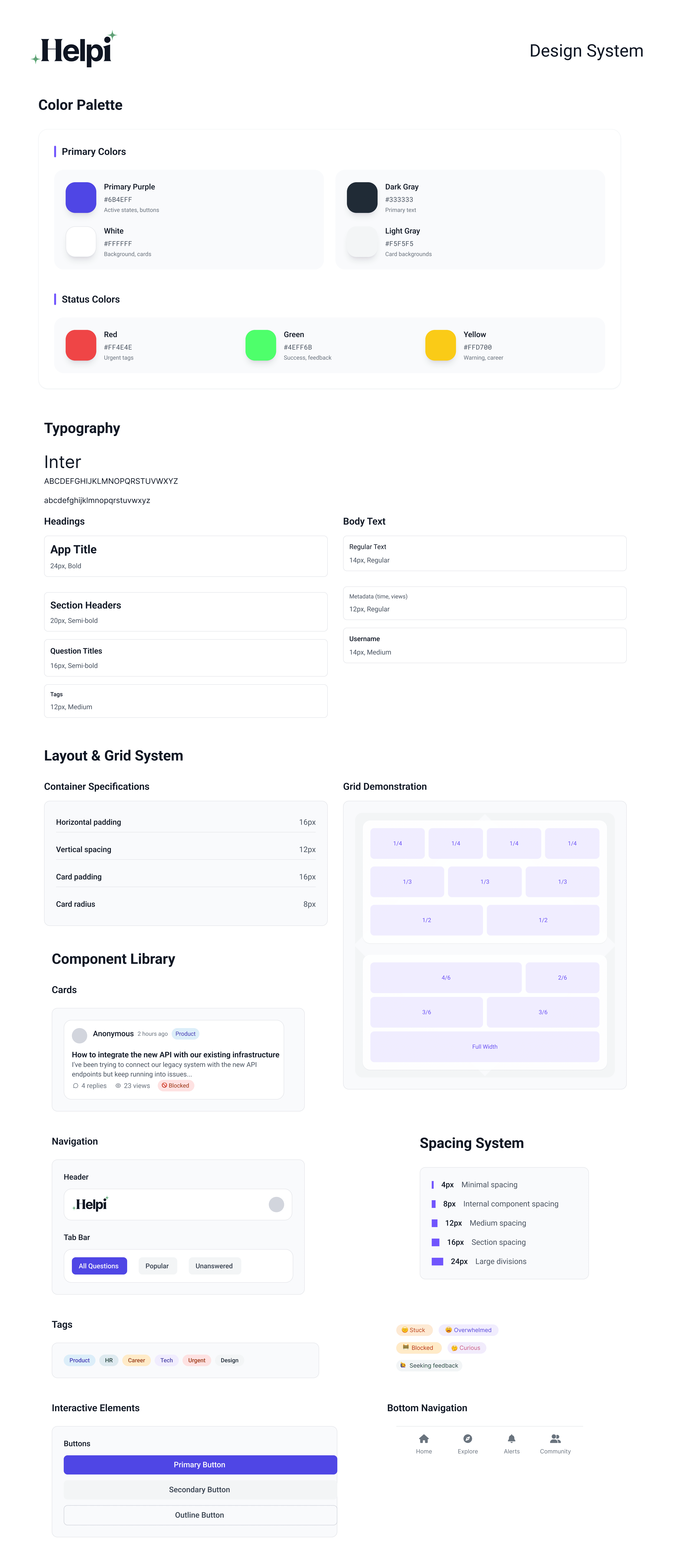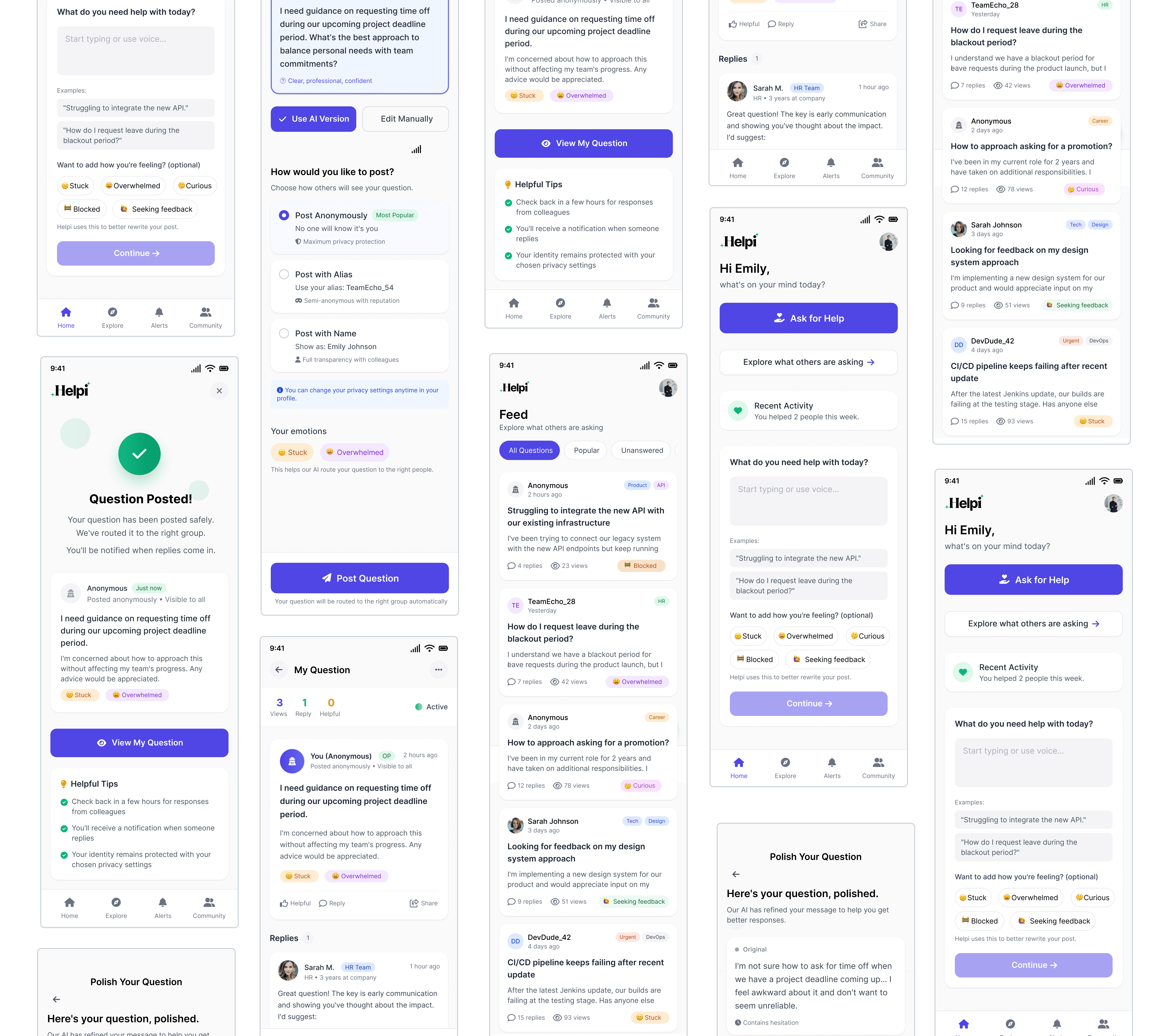 1️⃣2️⃣ Cultural Nudge | A week later, Helpi prompts her: “Post one thing you were afraid to ask last month.” | Taps “New Question” again | 🟦 Gentle nudge UI | Brave, engaged | Build a safe, open team culture |