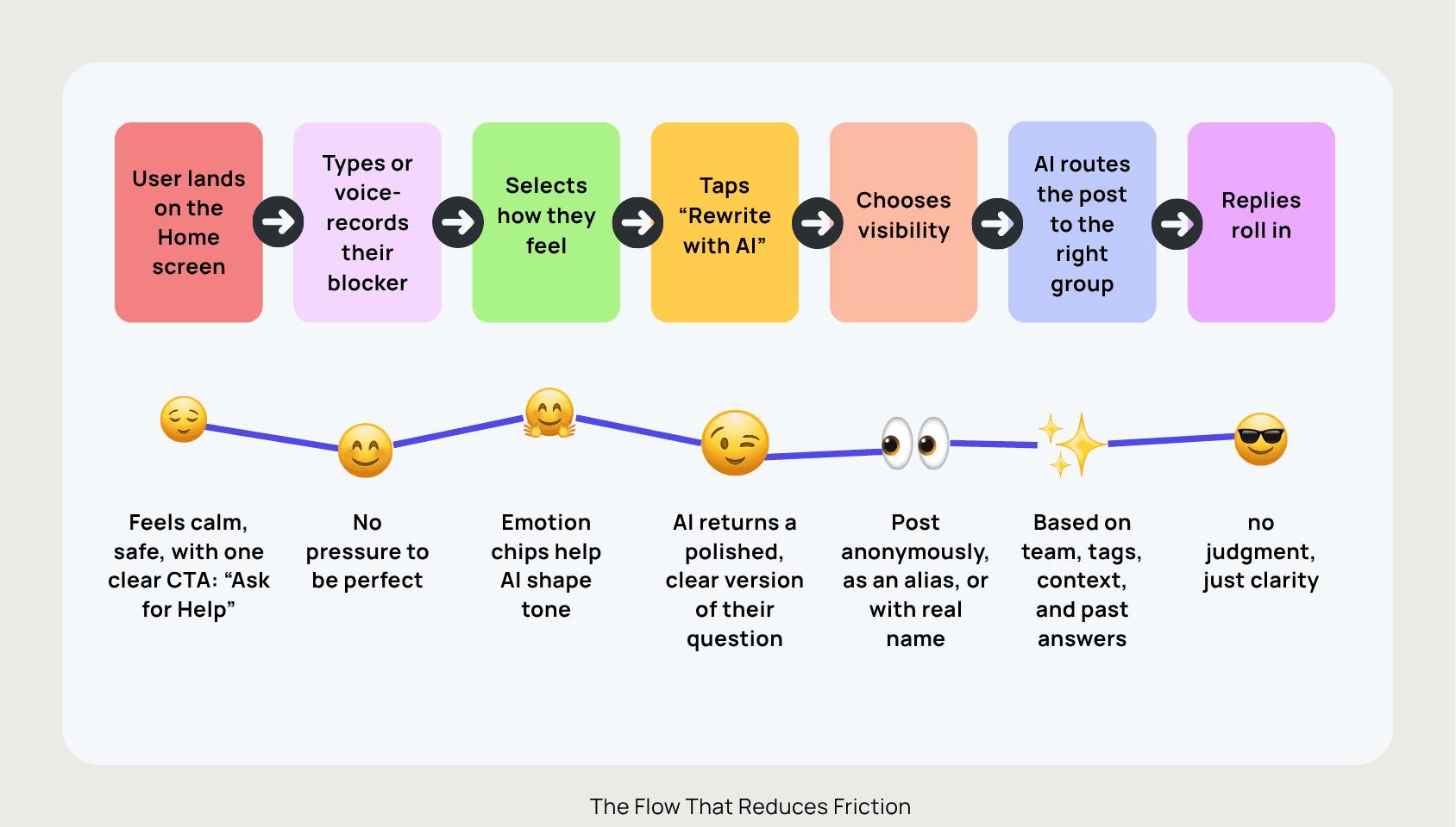 A mobile app UX concept that lets employees ask for help anonymously, have AI rewrite their message in a confident tone, and route it to the right person all without judgment.