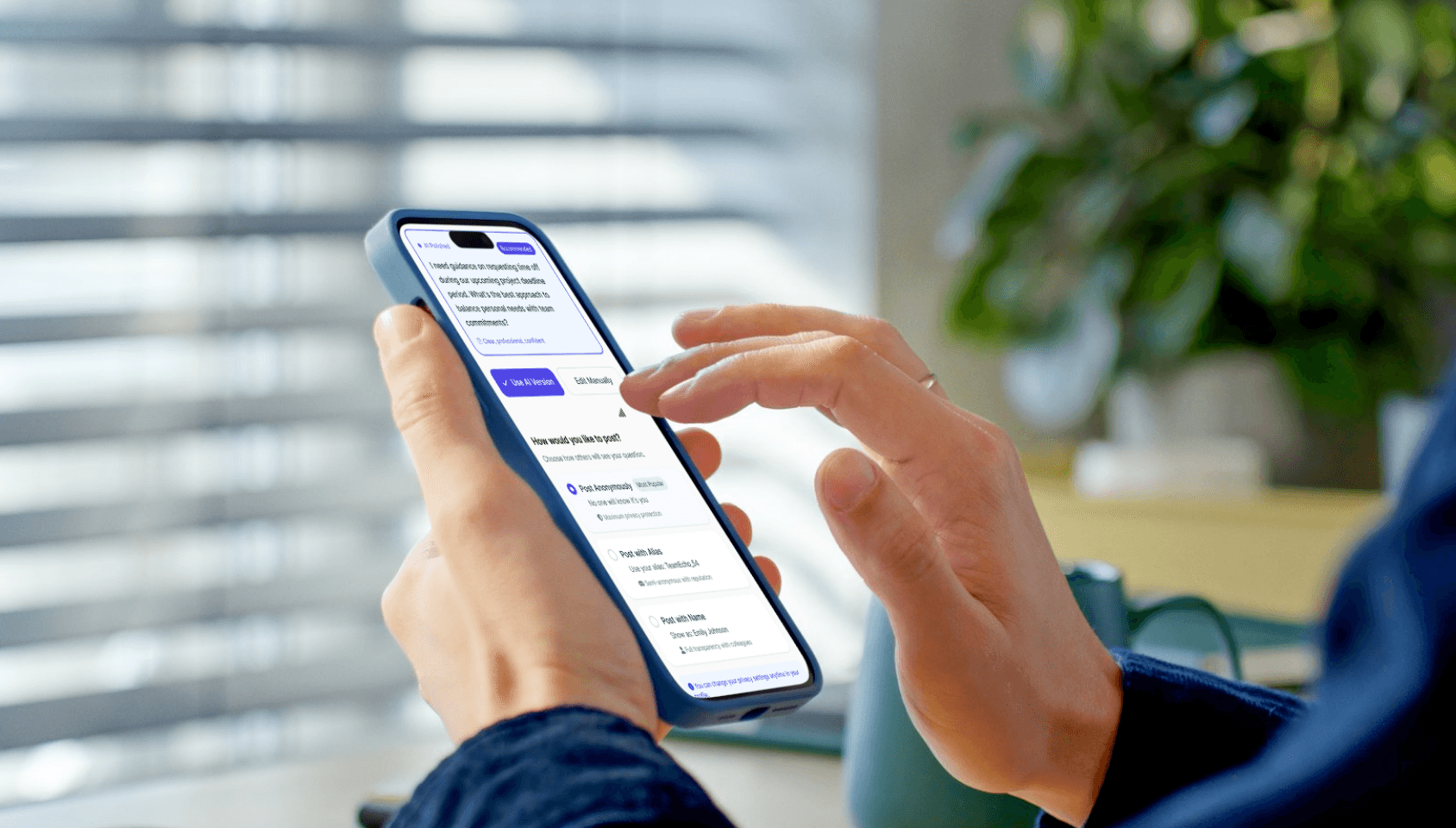 7️⃣ Privacy Choice | She previews the rewritten post, sets it to anonymous, and posts it. | Chooses "Anonymous" + Posts | 🟦 Privacy setting + Confirmation | Calm, confident | Let users own their visibility |